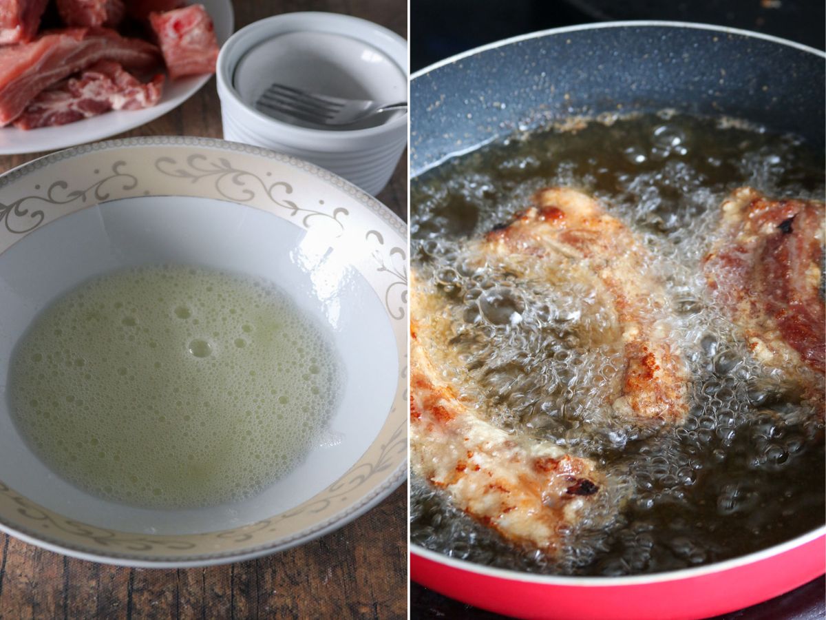 - Cut the spare ribs between the ribs into individual pieces. Marinate in egg whites, sprinkle with salt, and coat with cornstarch to tenderize the meat.