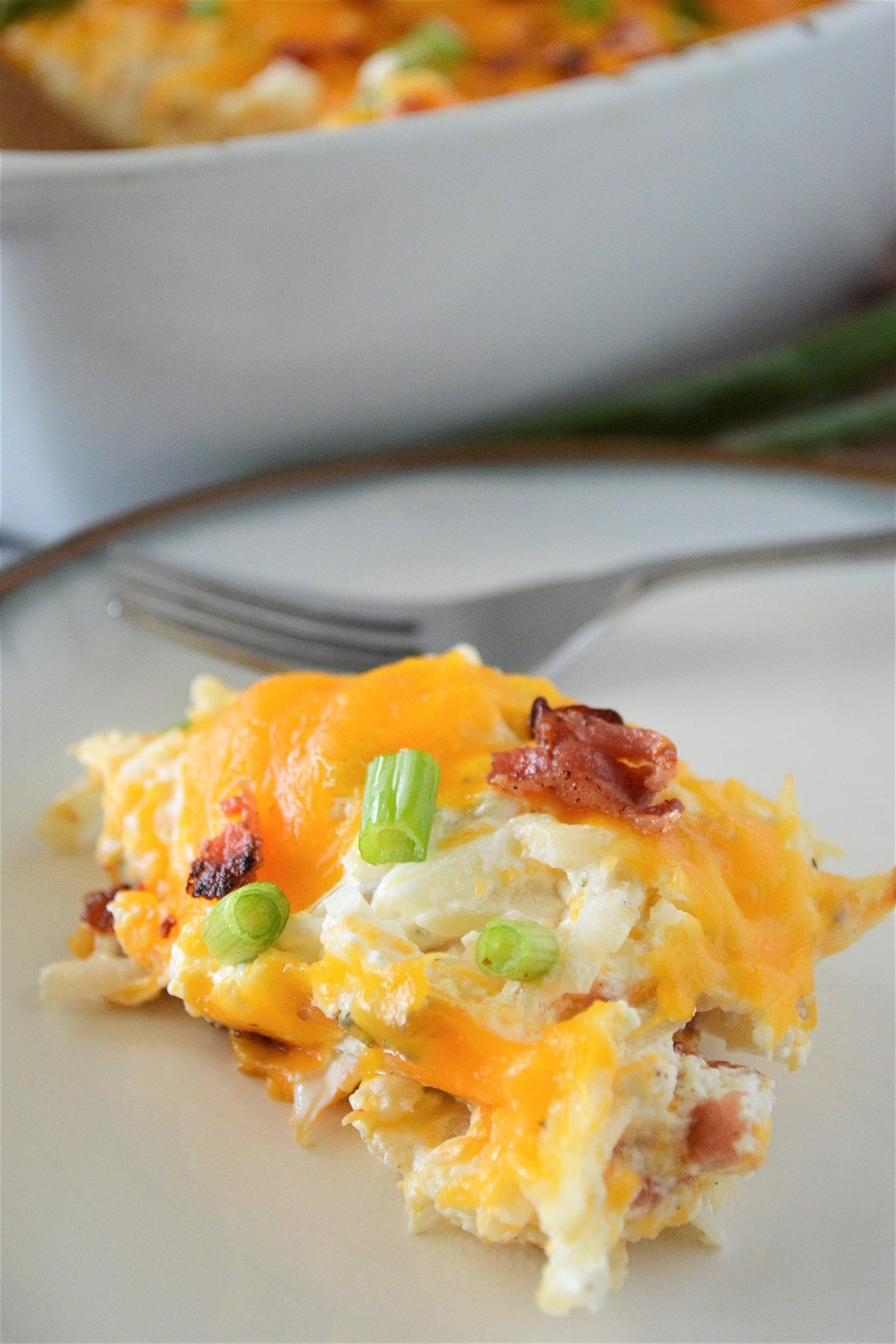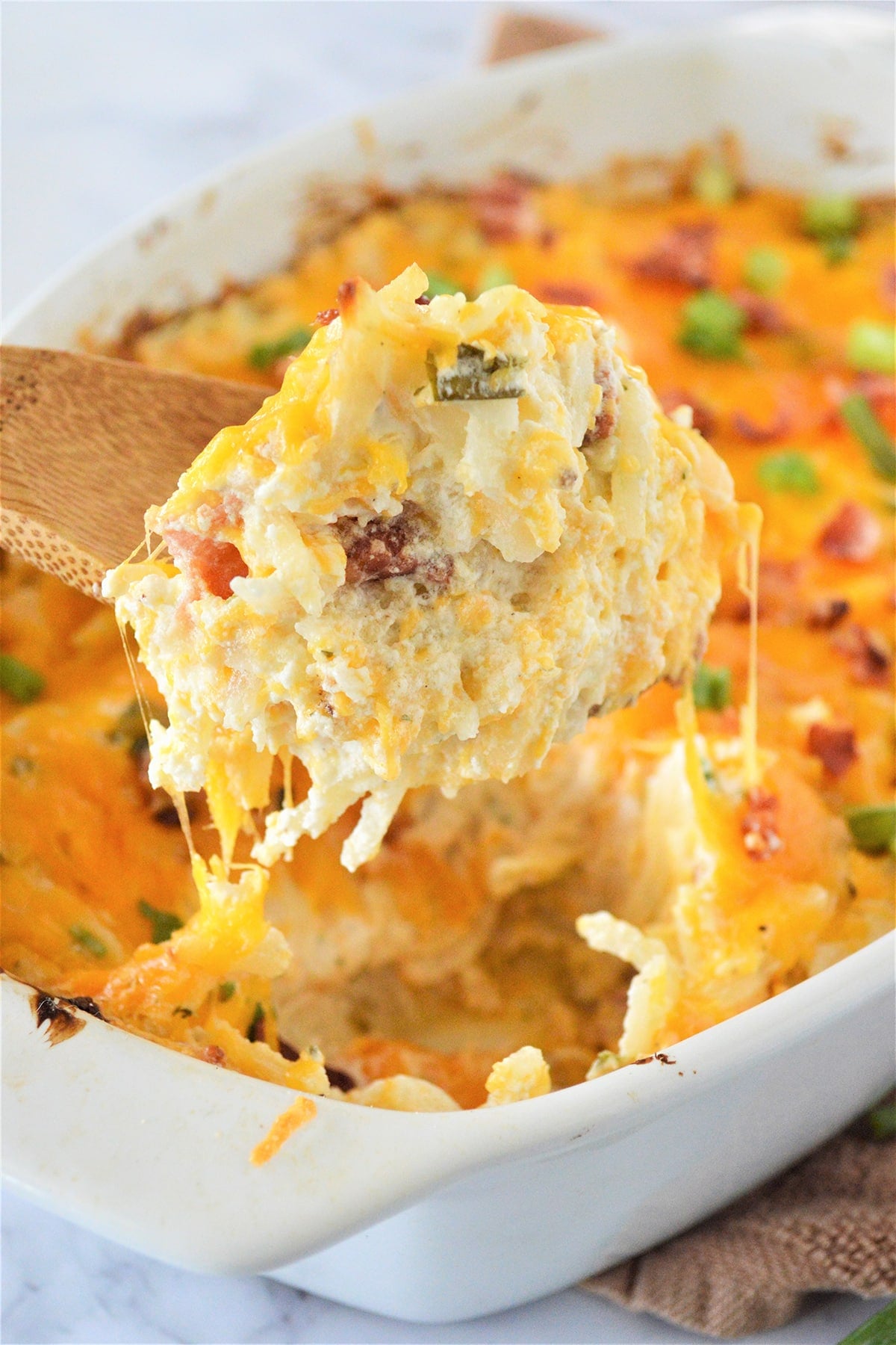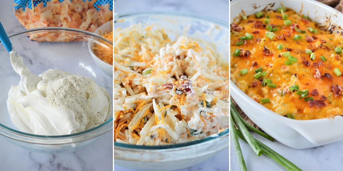 - Add hash browns, 2 cups of the cheese, bacon crumbles, and green onions. You can leave about 1 tablespoon of bacon and green onions to garnish potatoes once cooked. Transfer into a baking dish.
