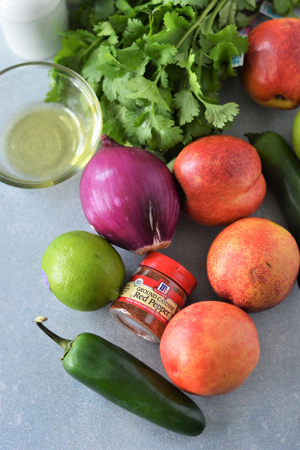 - In a bowl, combine nectarines, red onions, Jalapeno peppers, cilantro, lime juice, olive oil, salt, cayenne pepper and ground pepper. Toss to combine.