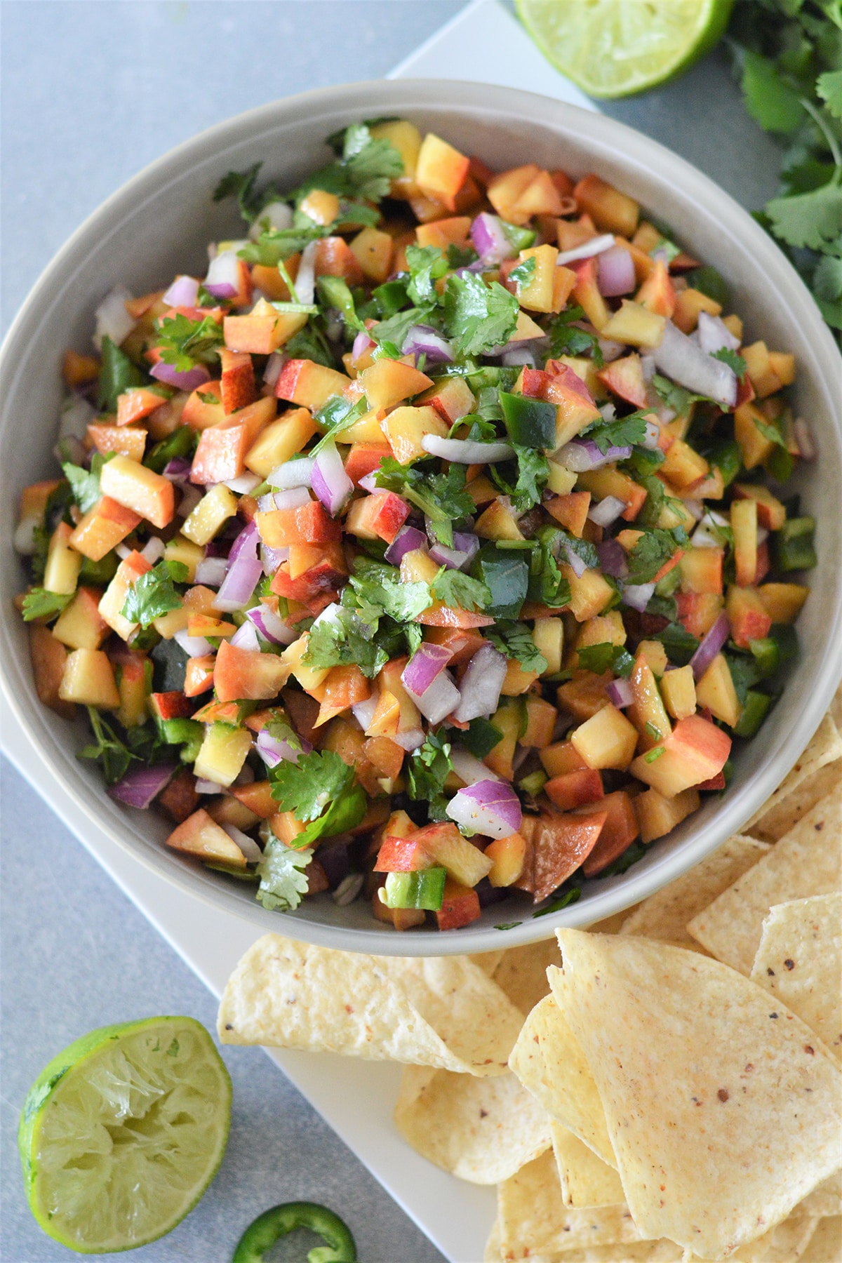 As proof of this love affair, we have a growing list on the blog, including Kiwi Mango and Strawberry Salsa, Watermelon Salsa, Cantaloupe Cucumber Salsa, and Berry Salsa with Honey Lime Dressing. And any list is incomplete without this refreshing medley of fragrant nectarines, onions, cilantro, spicy peppers, and freshly-squeezed citrus juice that’s like a party in your mouth!