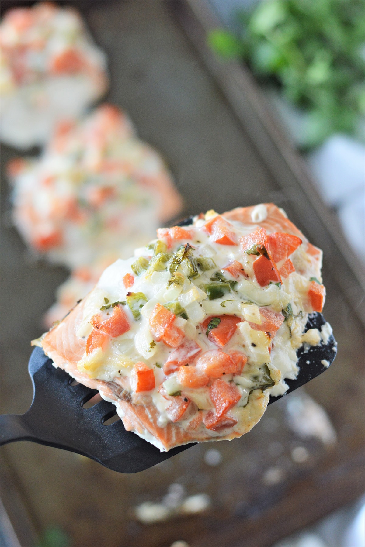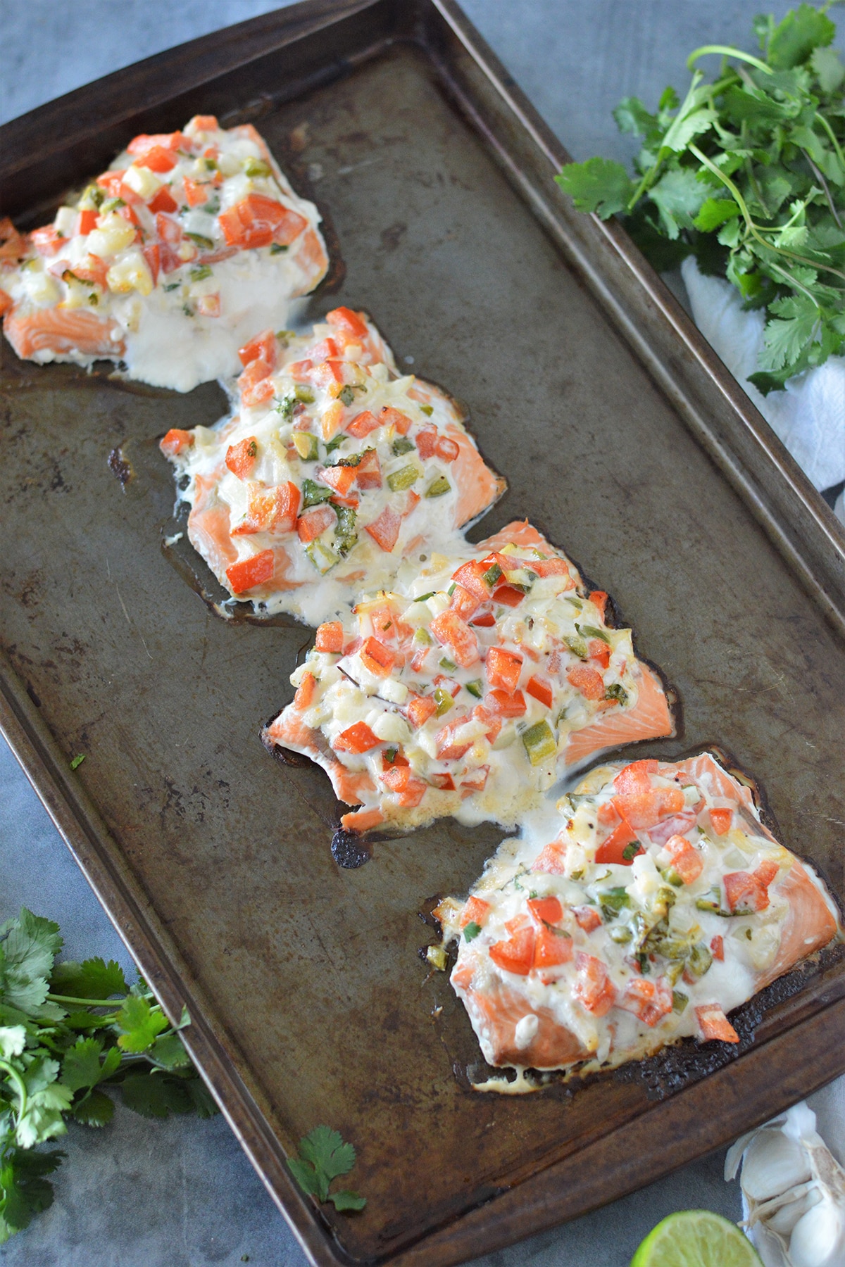 baked salmon with salsa mayo topping on a baking sheet with cilantro in the background.