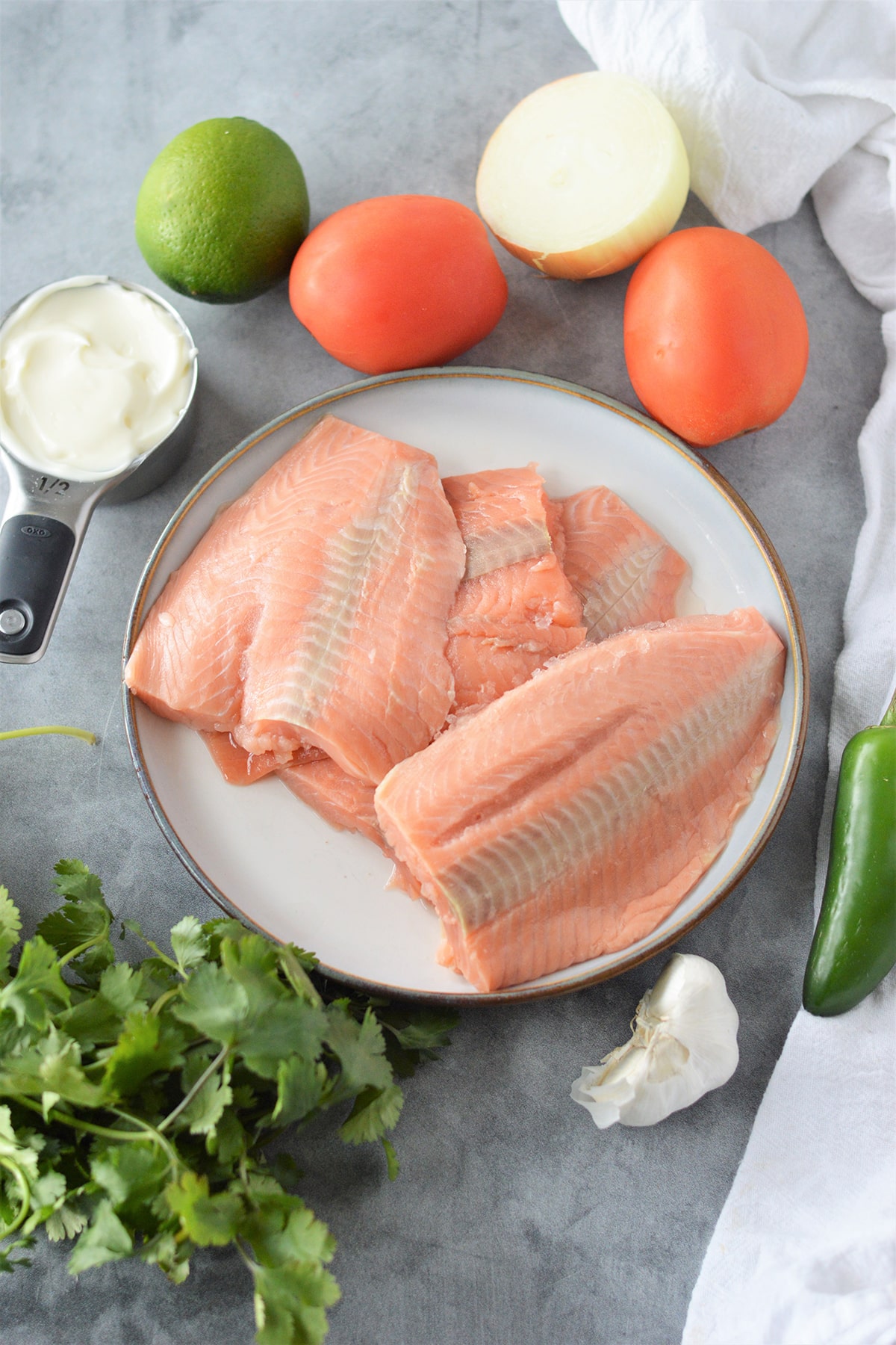 salmon fillets, tomatoes, lime, cilantro, onions, mayonnaise, garlic, jalapeno.