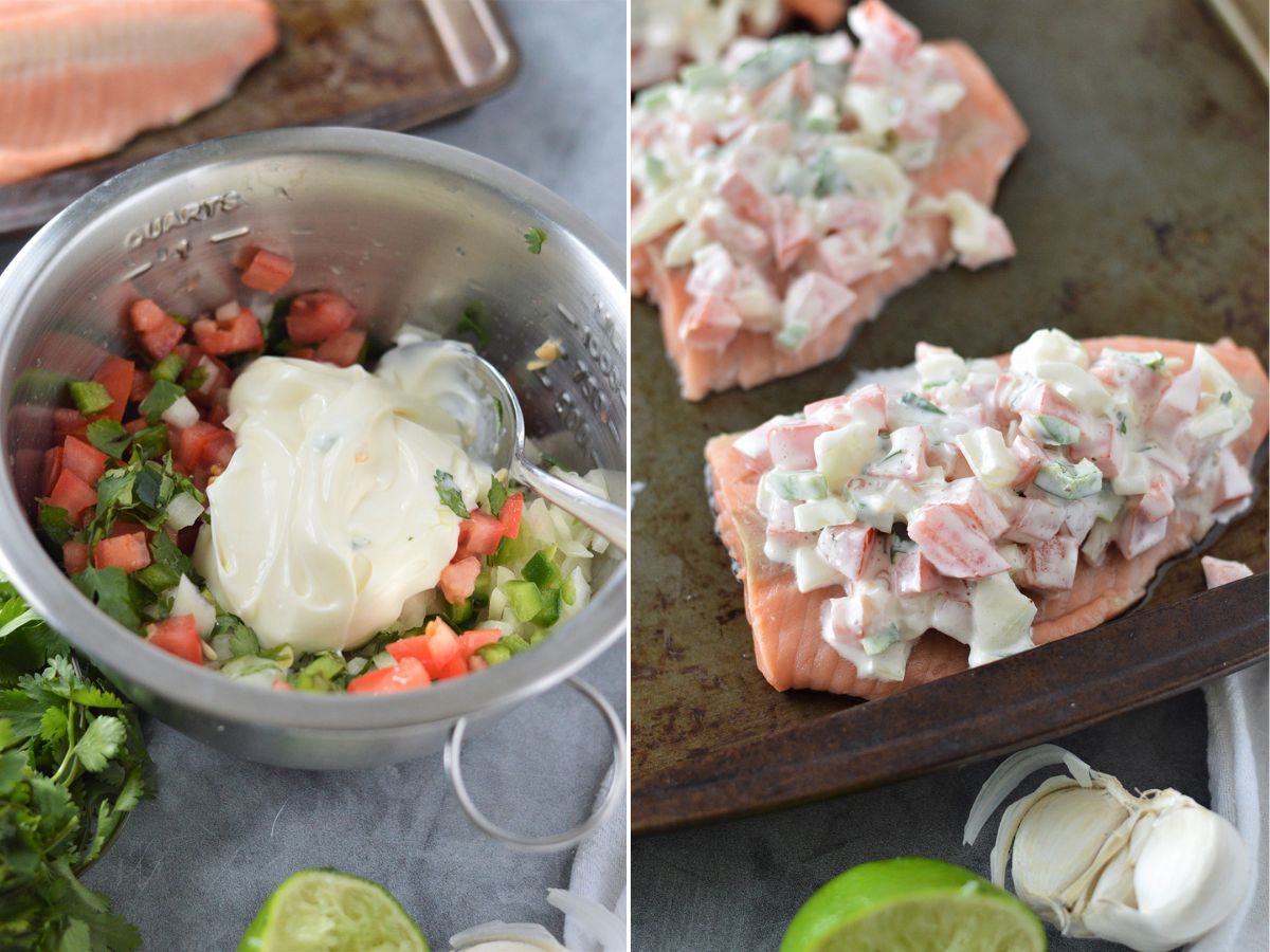 The secret to the moist and flavorful salmon? Mayonnaise! The fresh pico de gallo and mayonnaise add another layer of flavor and texture, and also act as a protective blanket that locks in the natural juices and keeps the fish from drying out during cooking.