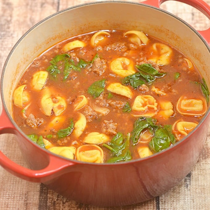 Sausage Tortellini Soup chockful of spicy Italian sausage, cheese tortellini, and baby spinach is hearty, delicious, and the perfect meal for chilly weather. Quick and easy to make and cooks in one pot!
