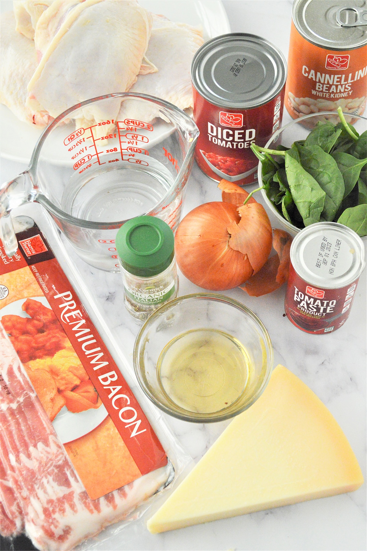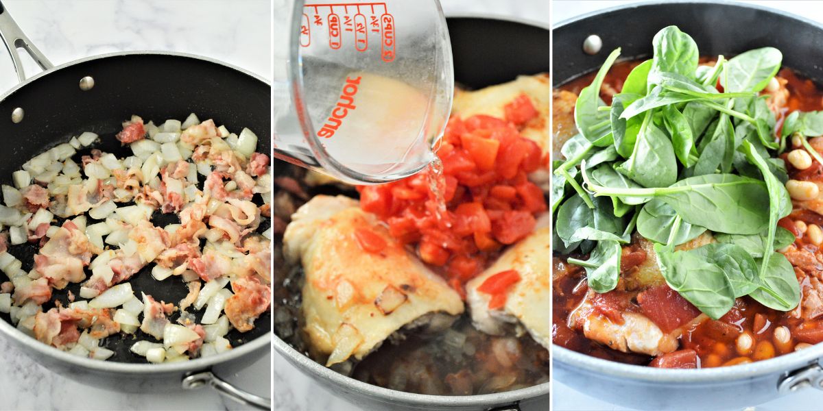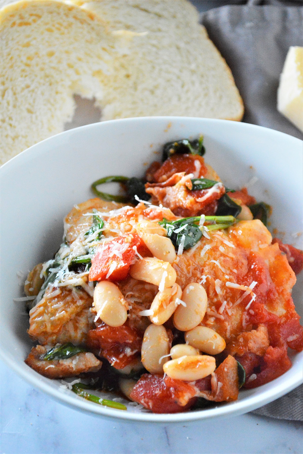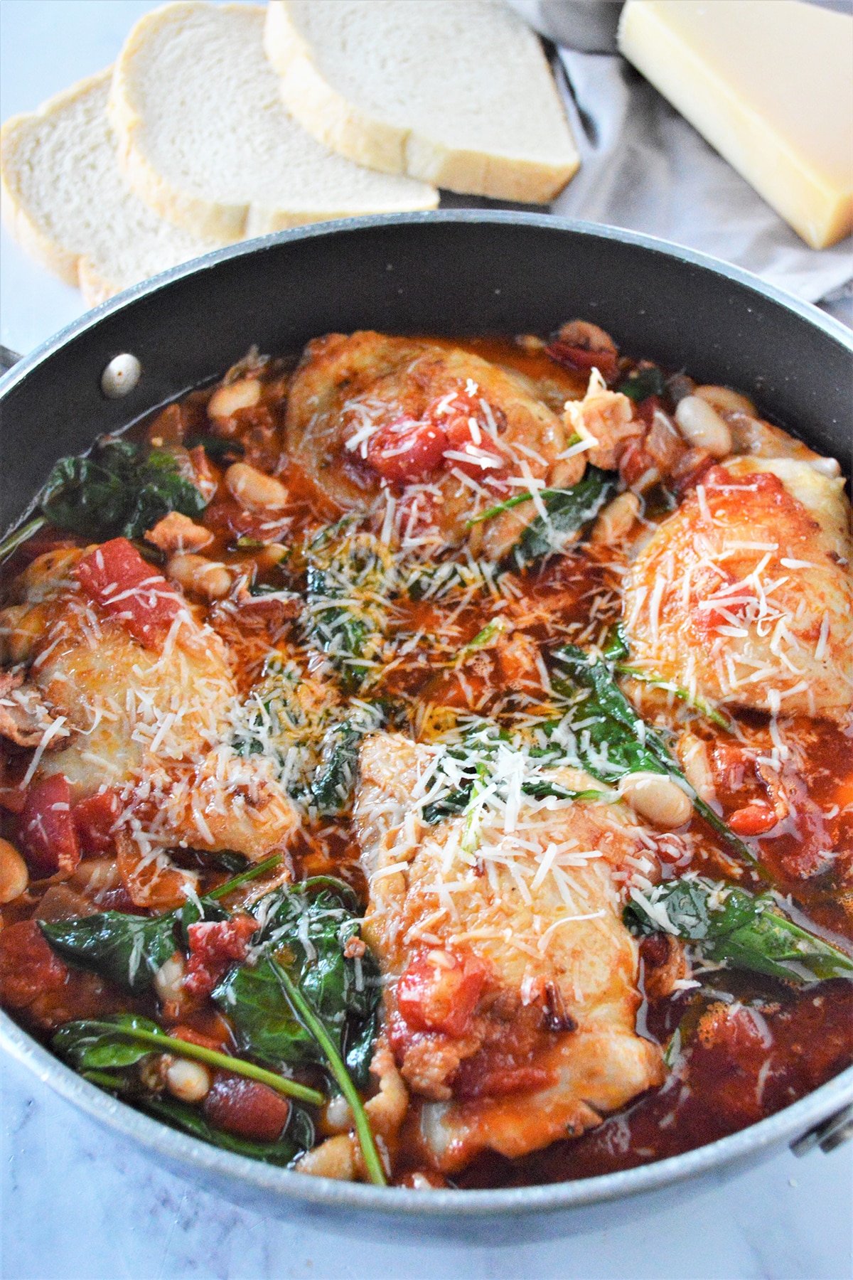 The magic starts by browning the chicken pieces with bacon for a smoky layer of flavor, then simmering the nicely seared meat in tomatoes and white wine to make a rich tomato gravy. It is then finished off with white beans, fresh spinach, and Parmesan cheese for the perfect stew!