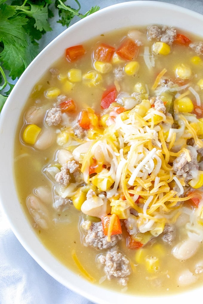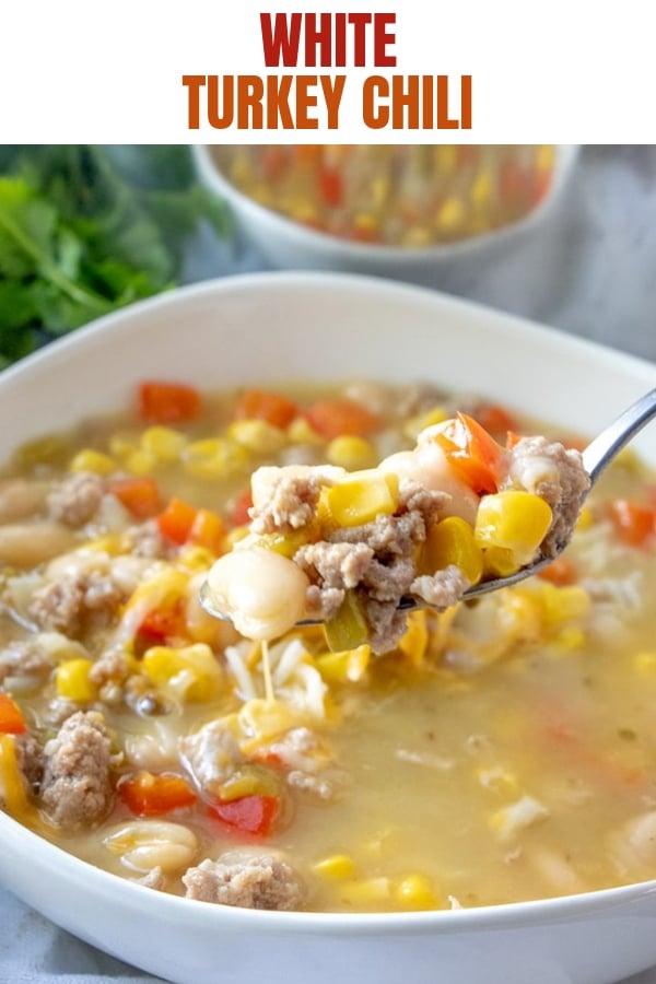 Now Summer is almost over and we’re heading to cooler weather, a generous helping of this white bean turkey chili is always a welcomed treat. I seriously can’t think of anything more comforting than loads of ground turkey, creamy white beans, sweet corn, and a boldly-flavored broth to cozy up to! It’s the best way to warm up if you ask me.